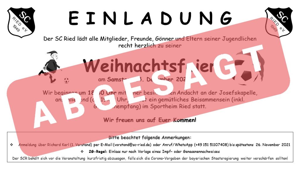 Nachdem sich die Vorstandschaft und das Wirtschaftsteam in der letzten Woche noch intensiv mit den Planungen für die vereinsinterne Weihnachtsfeier 2021 beschäftigt haben, ist man nun nach gemeinsamer Rücksprache mit dem Ausschuss zu dem Entschluss gekommen, auch in diesem Jahr die Feierlichkeiten nicht stattfinden zu lassen.