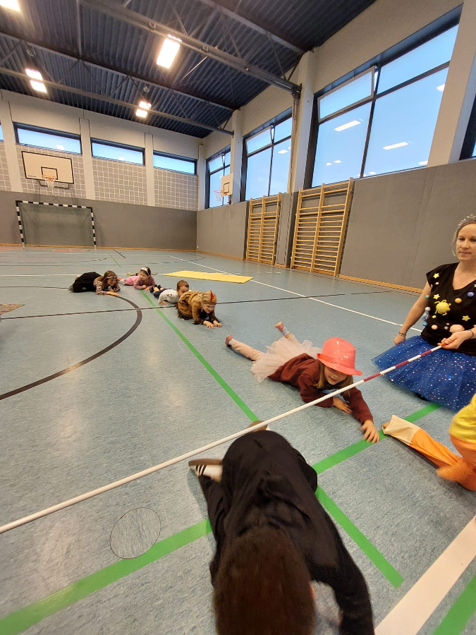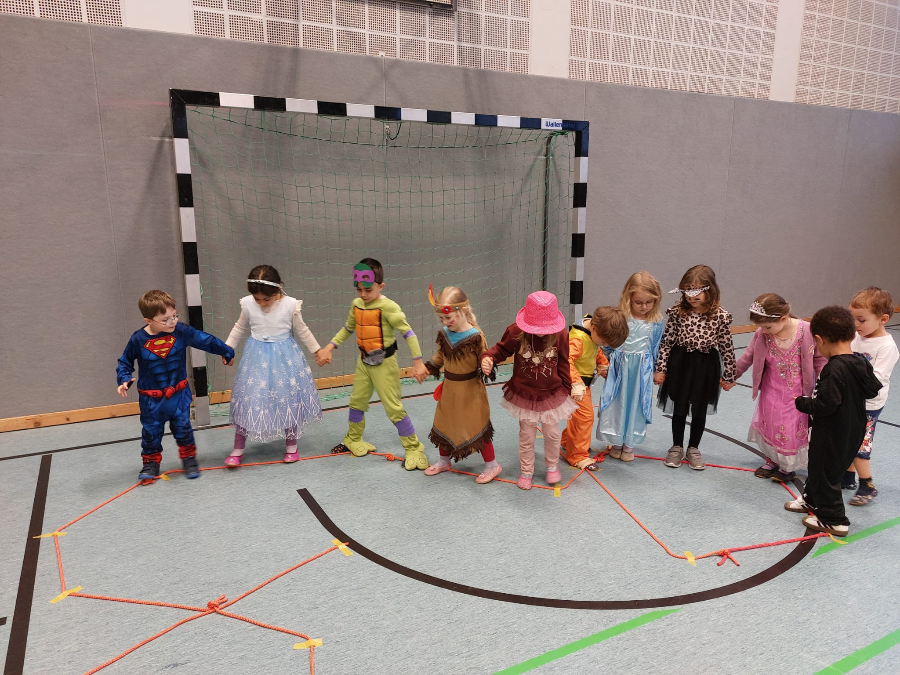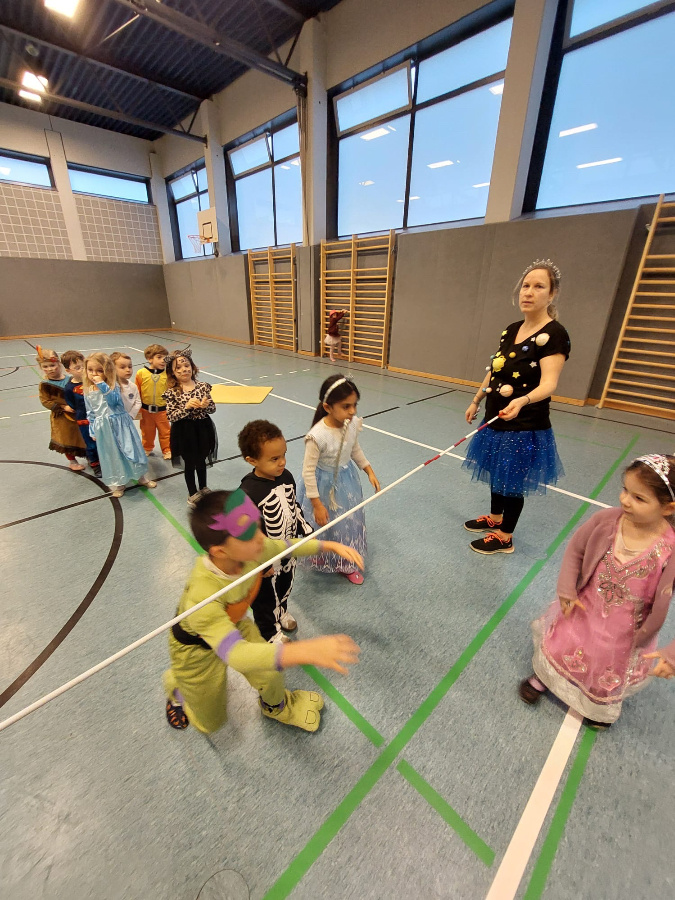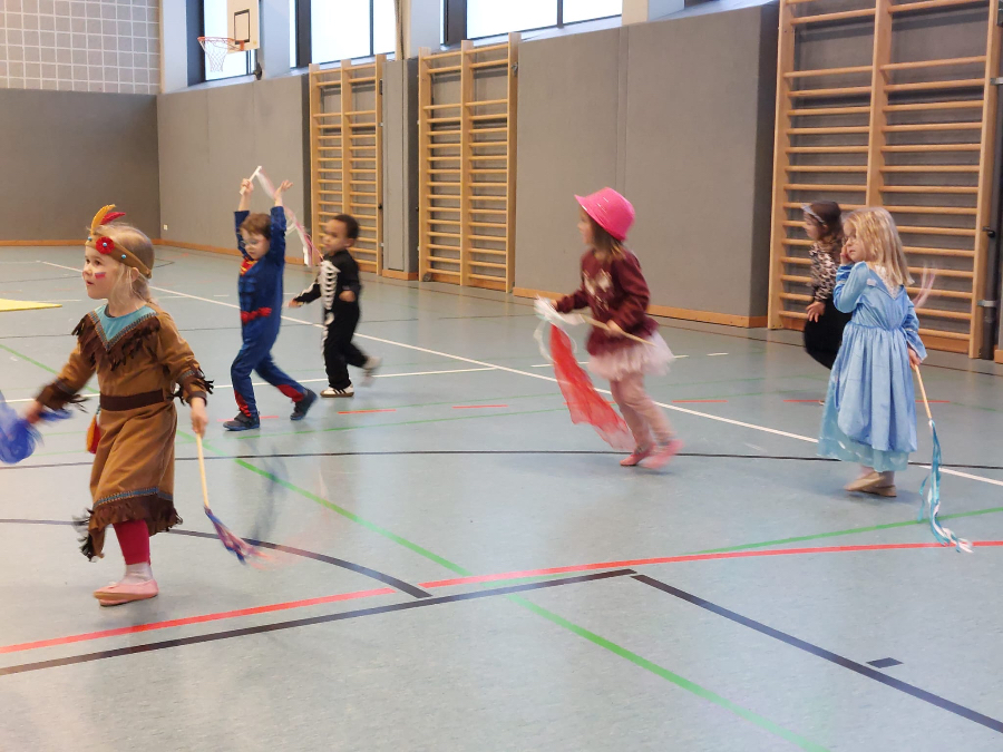 Die Kinder kamen in bunten Kostümen. Wir spielten verschiedene Bewegungsspiele wie Stopptanz und besonders viel Freude bereitete den Kindern die kleine Polonaise zum Abschied in die Umkleidekabine.